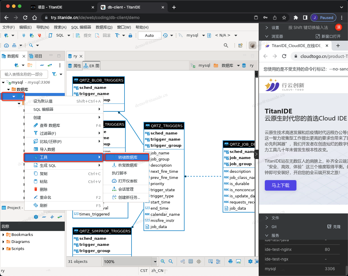 最近,我在使用 TitanIDE 开发云原生应用的时候,需要一个客户端操作数据库,我们一般都会在自己的电脑安装 NaviCat、Workbench、DBeaver 等数据库客户端工具。这些工具都挺好用的。不过呢,NaviCat 想说爱你不容易,虽然MySQL Workbench 是免费的,但是仅支持 MySQL。最后找到了 DBeaver,发现 DBeaver 通过 JDBC 连接到数据库,可以支持几乎所有的数据库产品,还开源、免费。但问题是,TitanIDE 是运行在云端,通过浏览器来访问的,而以上工具皆运行在本地桌面操作系统内部,一个在云端,一个在本地,TitanIDE 和 DBeaver 是怎么坠入爱河的呢?且听我娓娓道来......