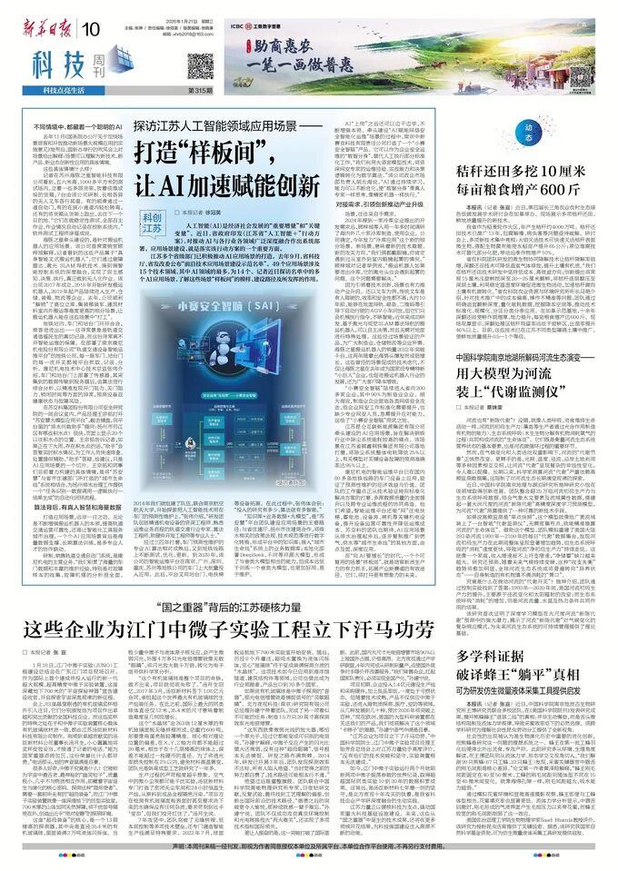 2026年1月21日,《新华日报》以《探访江苏人工智能领域应用场景——打造“样板间”, 让AI加速赋能创新》为题,报道了三亿体育等入选江苏省“前沿技术应用场景建设示范名单”企业,在应用场景建设方面的实践与成效。