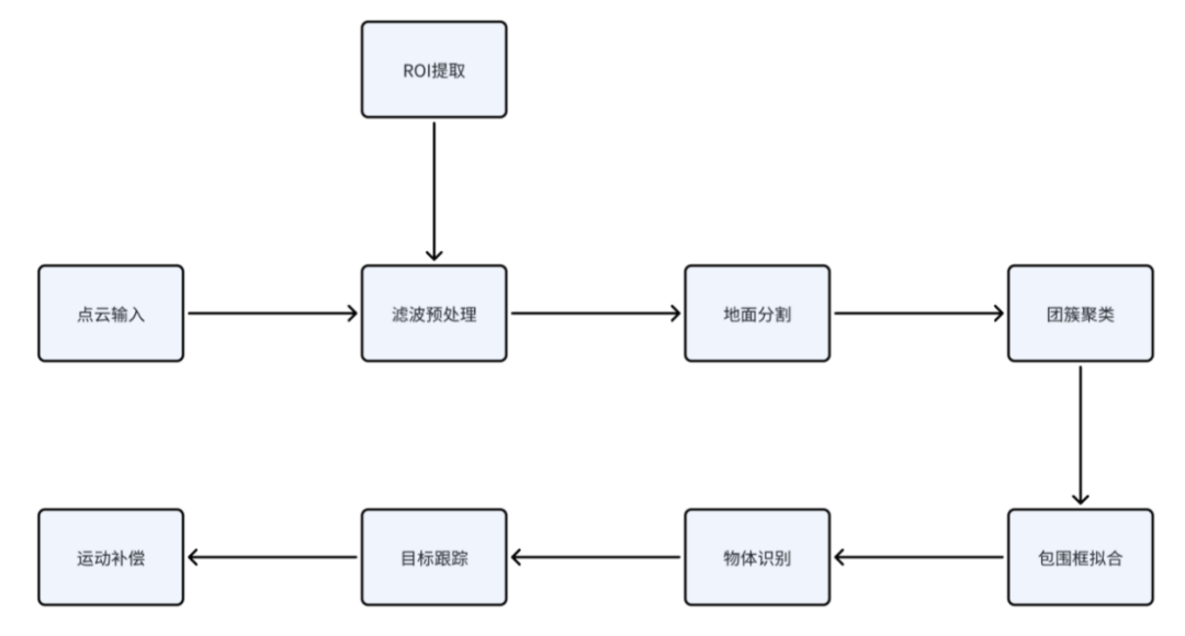 全局避障处理流程:针对点云数据量大且含噪声的问题,先进行滤波降采样;分割地面点云后,通过聚类算法分割地面障碍物团簇,拟合包围框标注中心/尺寸等属性;结合点云目标检测框架(如PointPillar)进行语义标注与跟踪,并构建卡尔曼滤波器平滑轨迹,同步优化算力保障实时性;存在运动畸变时需补偿校正。