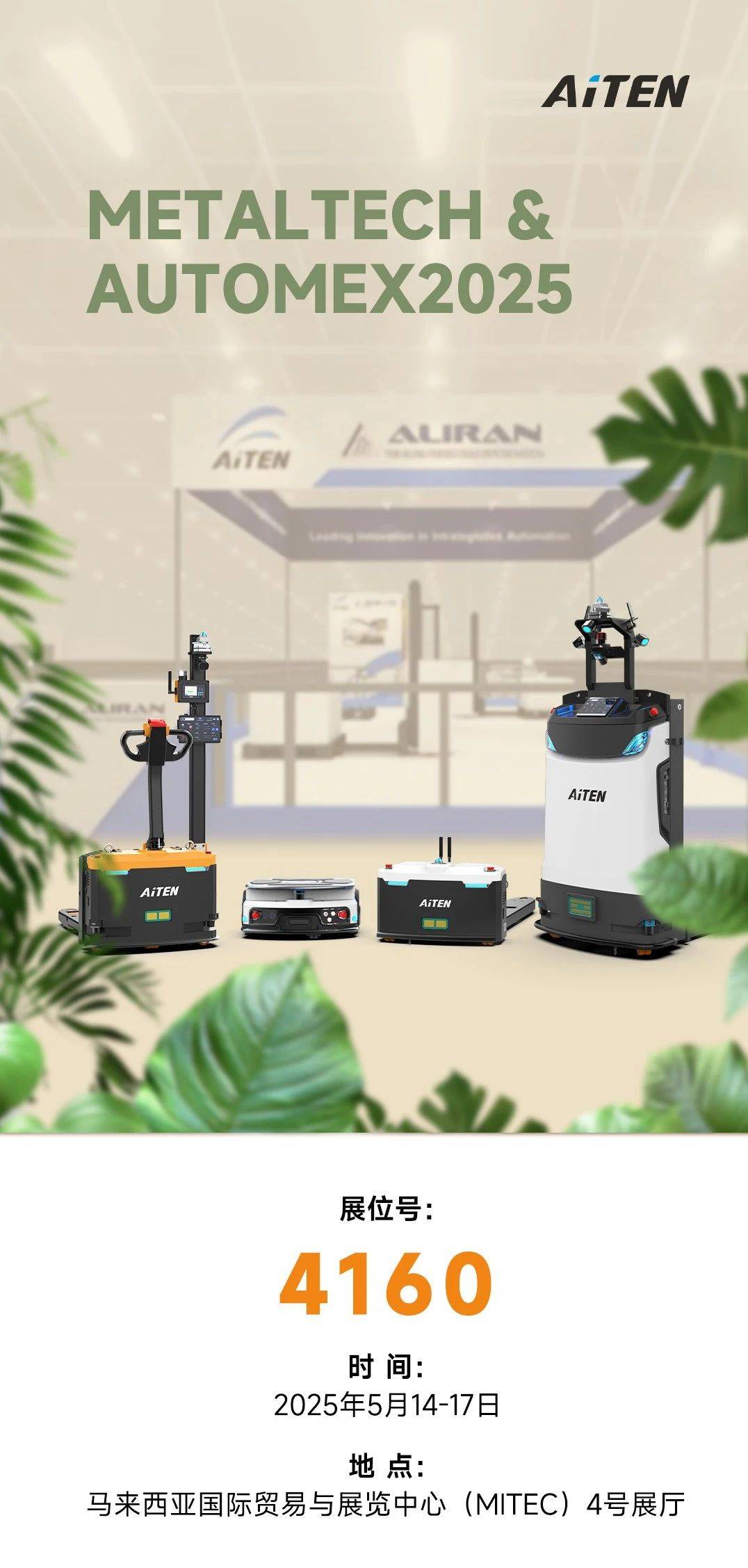 倒计时启动!诚邀您参与现场动态演示,leyuAiTEN将携搬运移动机器人AM15,MP10,APE15,TT15惊艳亮相(2025.5.14-17)。